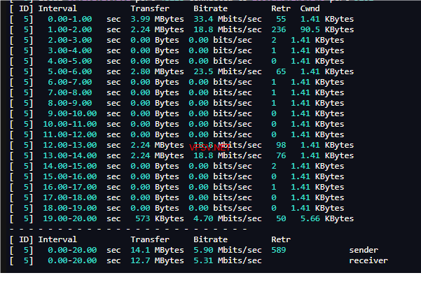 [ 5] 19.00-20.00 sec 11.4 MBytes 95.4 Mbits/sec